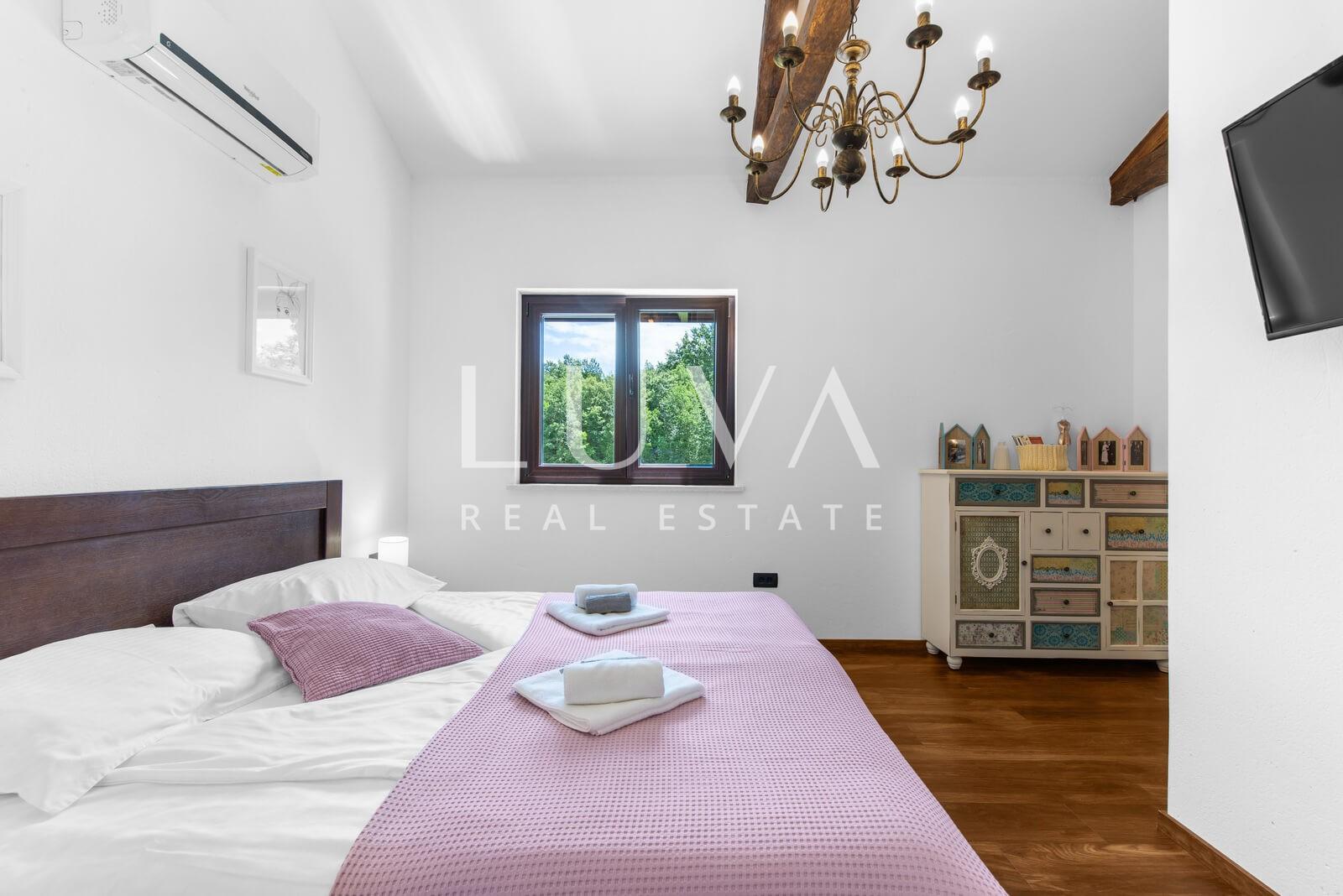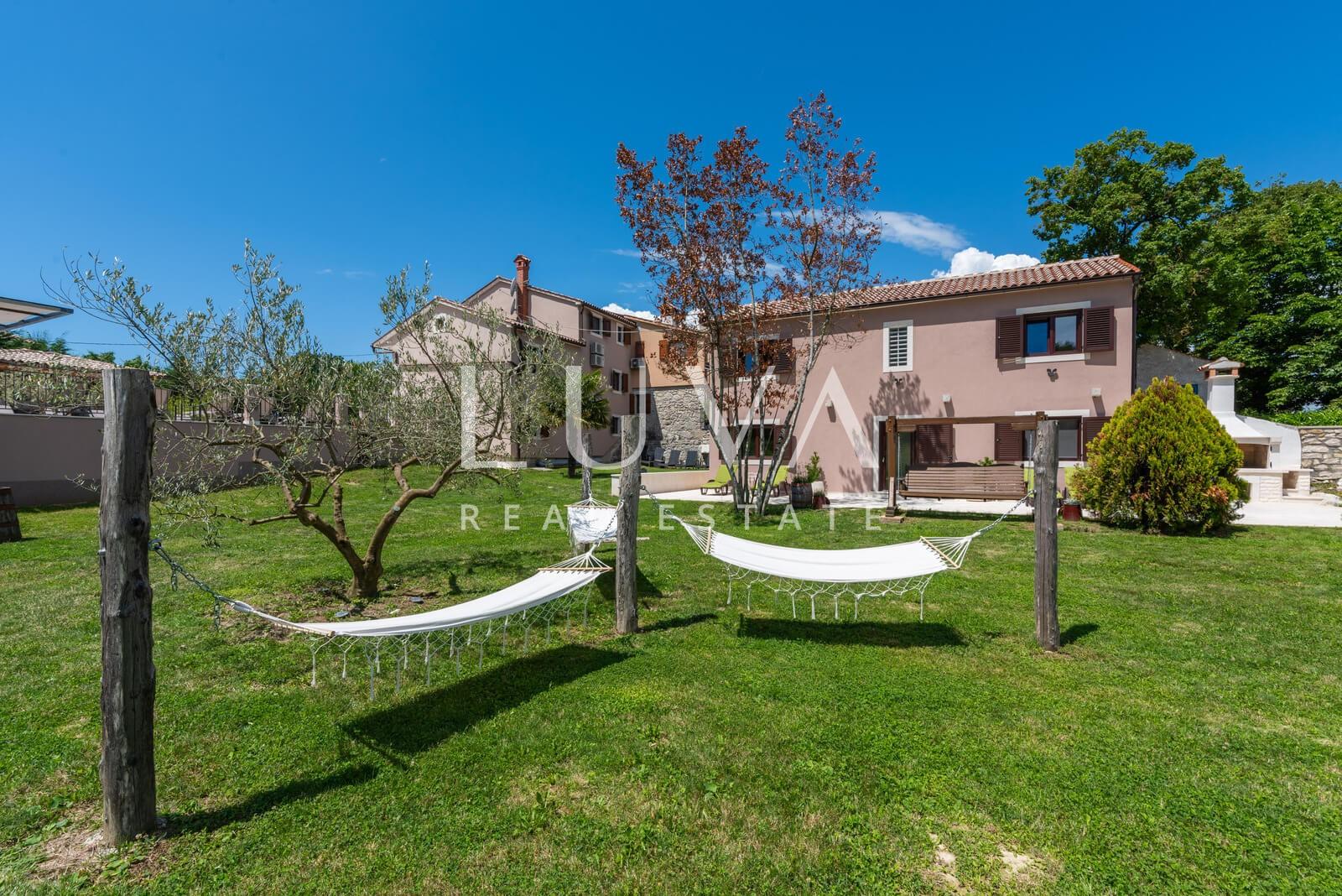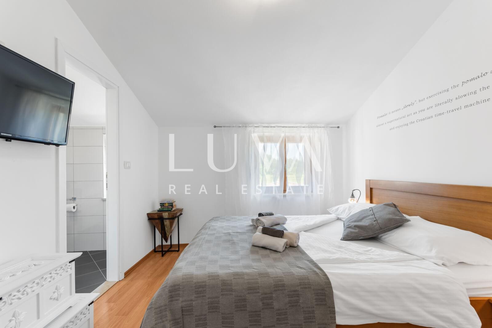 Das Haupthaus erstreckt sich über zwei Etagen und verbindet rustikalen Charme mit modernen Annehmlichkeiten. Im Erdgeschoss befindet sich ein großzügiger offener Wohnbereich mit Esszimmer und voll ausgestatteter Küche, während im Obergeschoss vier Schlafzimmer, jeweils mit eigenem Bad, untergebracht sind. Vor dem Haus lädt eine überdachte Terrasse dazu ein, bei einem Glas Wein den Sonnenuntergang und den Blick auf die friedliche Landschaft Istriens zu genießen.