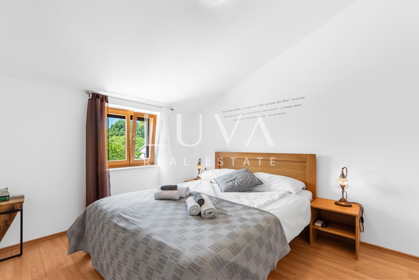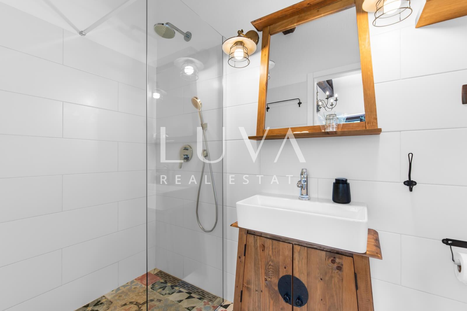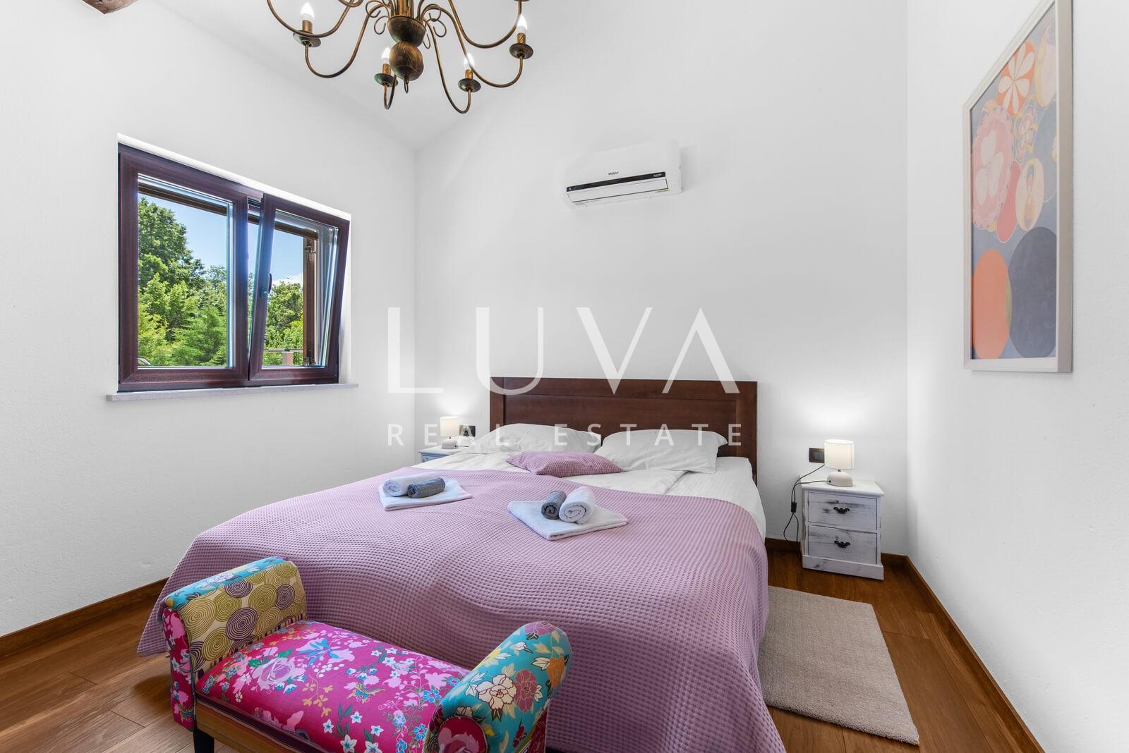 Das Haupthaus erstreckt sich über zwei Etagen und verbindet rustikalen Charme mit modernen Annehmlichkeiten. Im Erdgeschoss befindet sich ein großzügiger offener Wohnbereich mit Esszimmer und voll ausgestatteter Küche, während im Obergeschoss vier Schlafzimmer, jeweils mit eigenem Bad, untergebracht sind. Vor dem Haus lädt eine überdachte Terrasse dazu ein, bei einem Glas Wein den Sonnenuntergang und den Blick auf die friedliche Landschaft Istriens zu genießen.