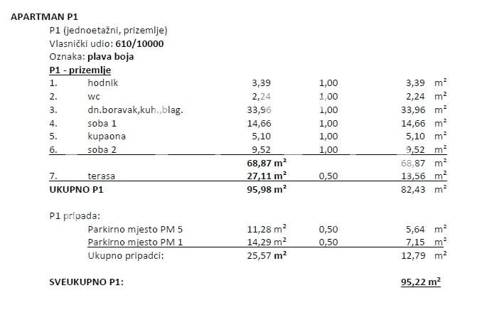 Die Wohnung hat eine Gesamtfläche von 95,22 m² (mit Koeffizienten ausgedrückt), während die Bruttofläche der Wohnung 95,98 m² beträgt. Die Innenwohnfläche von 68,87 m² umfasst zwei Schlafzimmer, ein Badezimmer und ein zusätzliches WC.