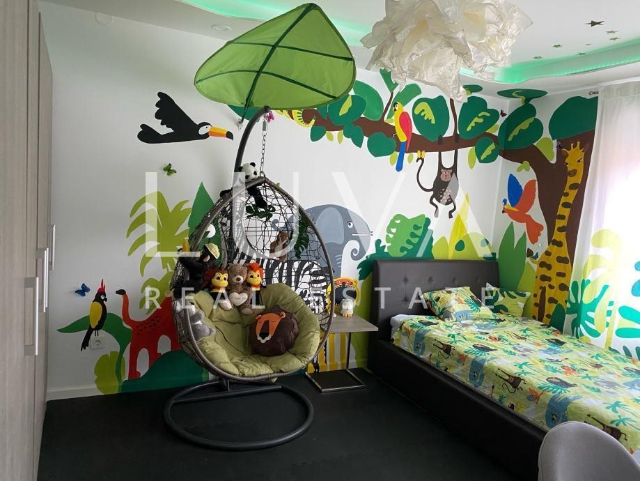 Das Kinderzimmer, gestaltet im fröhlichen „Dschungel“-Stil, ist ein kleines Kunstwerk – bemalte Wände, grüne Dekorationen, Vorhänge und Bettwäsche schaffen eine verspielte Umgebung, während die Decke in Form von Wolken mit LED-Beleuchtung in Farben Wärme und Magie bringt.