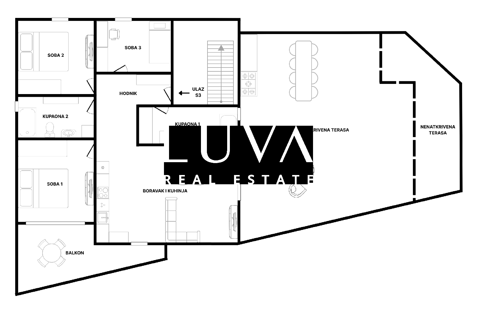 Die Raumaufteilung umfasst einen Eingangsbereich, ein großzügiges, offenes Wohnzimmer mit Küche und Essbereich mit Zugang zu einer großen Terrasse, drei Schlafzimmer mit Balkonzugang, zwei Badezimmer, ein separates WC sowie einen Abstellraum.