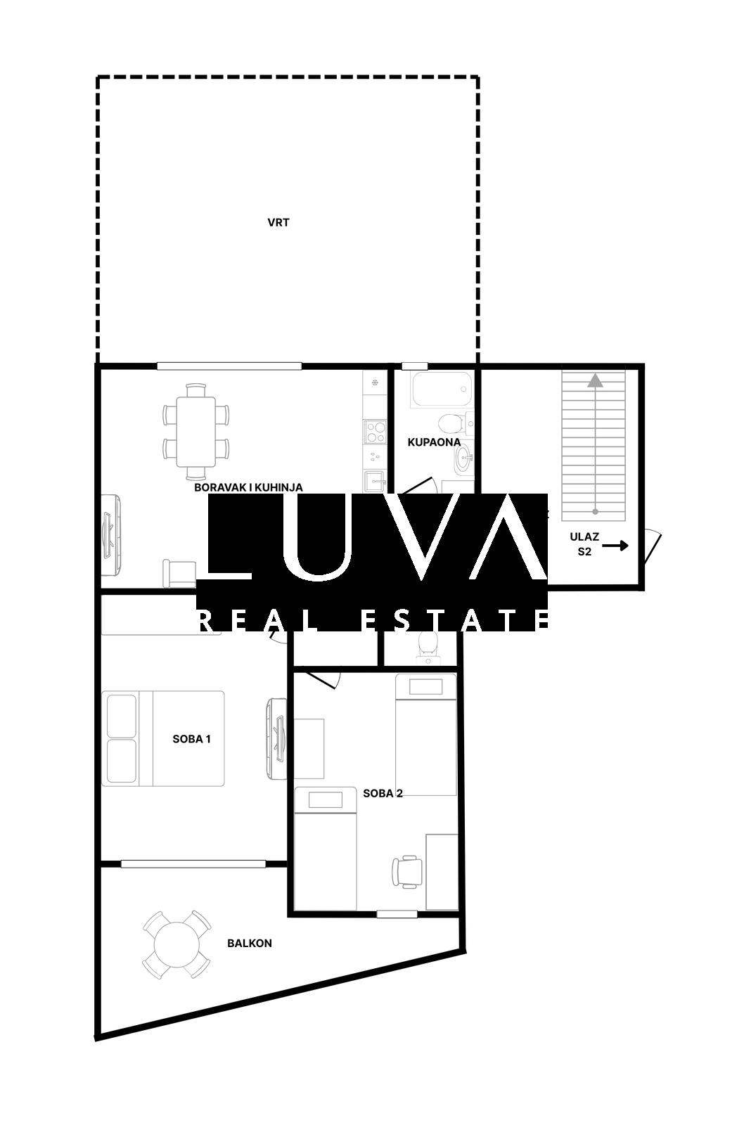 Die Raumaufteilung umfasst einen Eingangsbereich, ein großzügiges, offenes Wohnzimmer mit Küche und Essbereich mit Zugang zu einem großen privaten Garten, zwei Schlafzimmer mit Balkonzugang, ein Badezimmer, ein separates WC sowie einen Abstellraum.