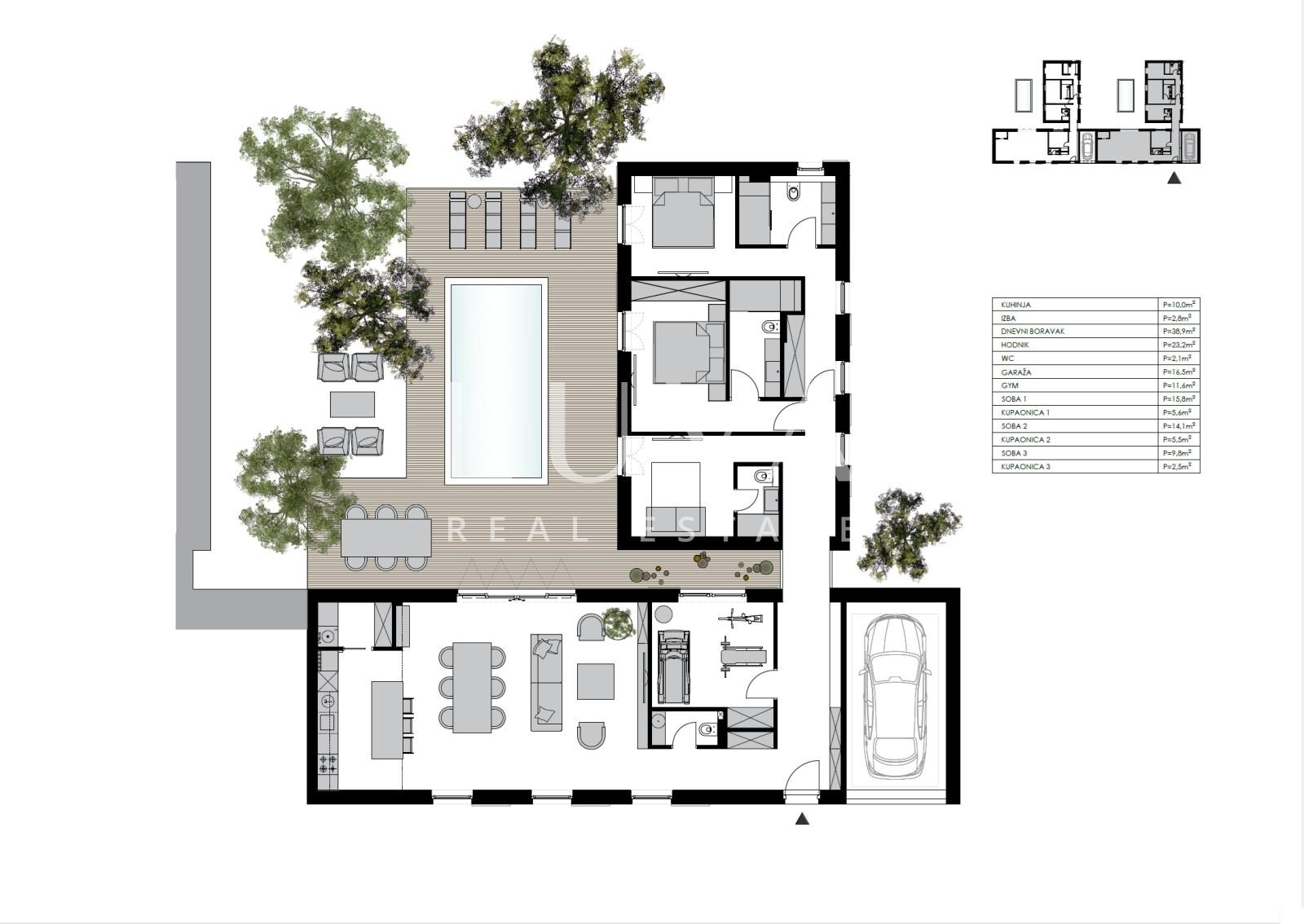 The house offers 140 m² of net living area plus a garage. The interior layout is designed to meet high standards of modern living. Three spacious bedrooms each feature their own en-suite bathroom, while an additional room is intended as a fitness area, with the option of easy conversion into a fourth bedroom.