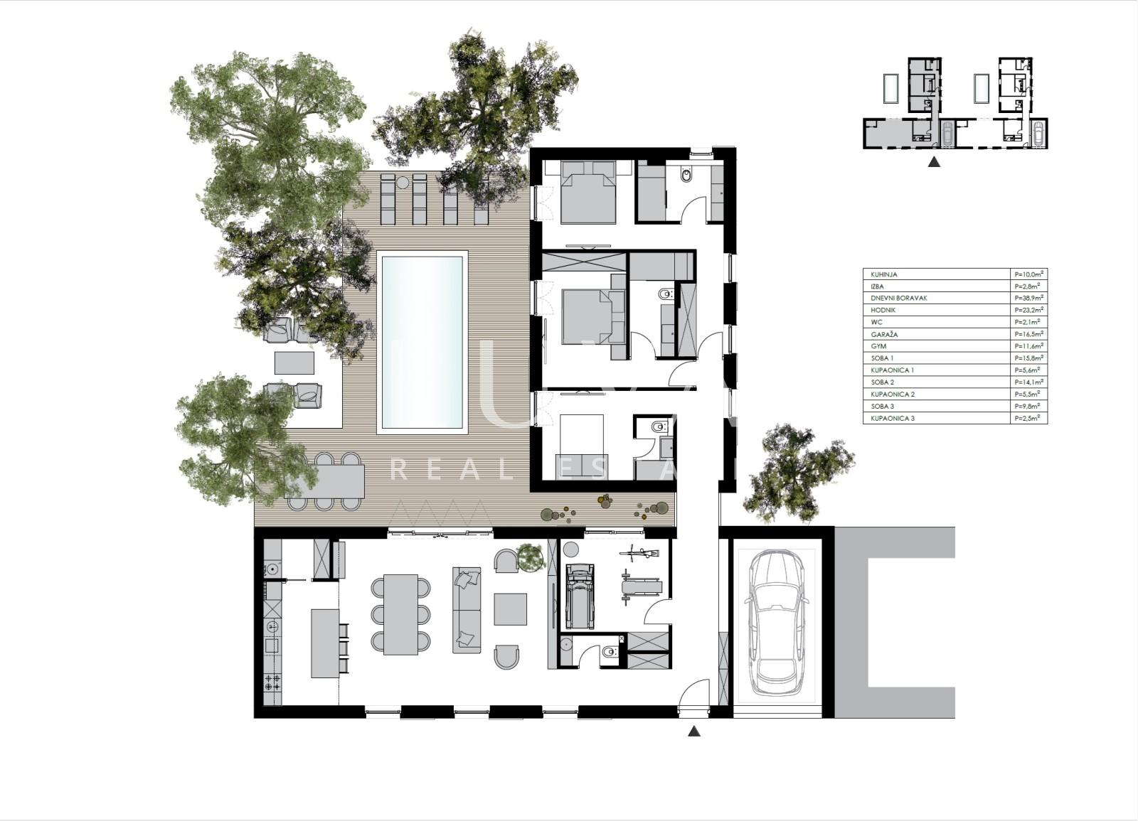 The house offers 140 m² of net living area plus a garage. The interior layout is designed to meet high standards of modern living. Three spacious bedrooms each feature their own en-suite bathroom, while an additional room is intended as a fitness area, with the option of easy conversion into a fourth bedroom.