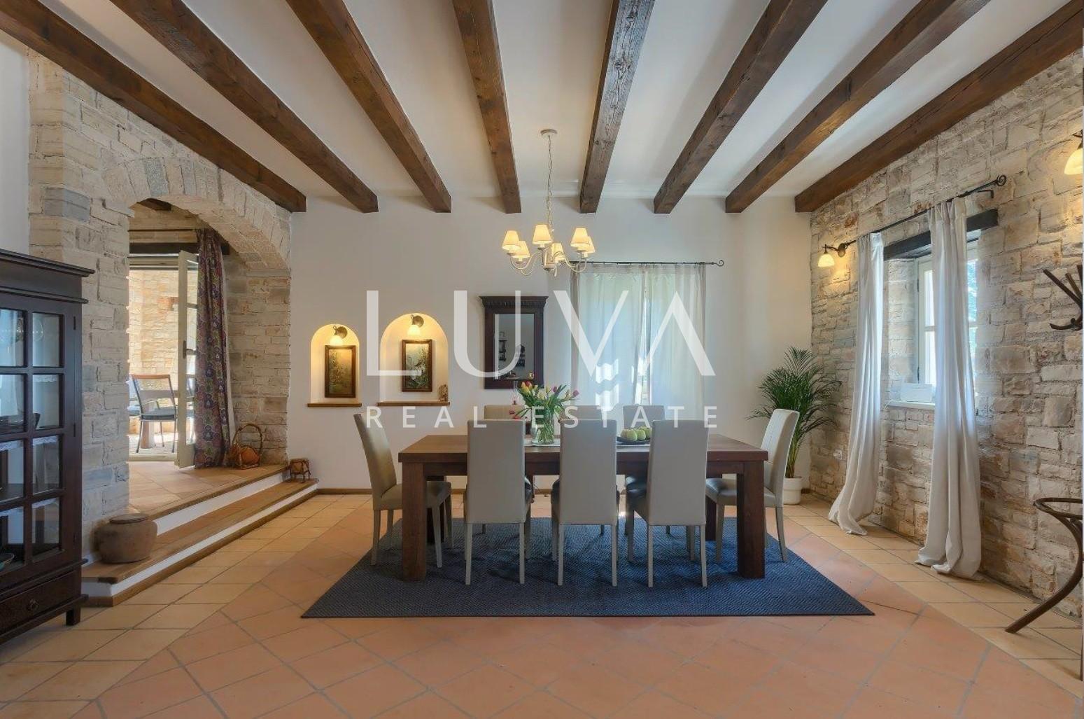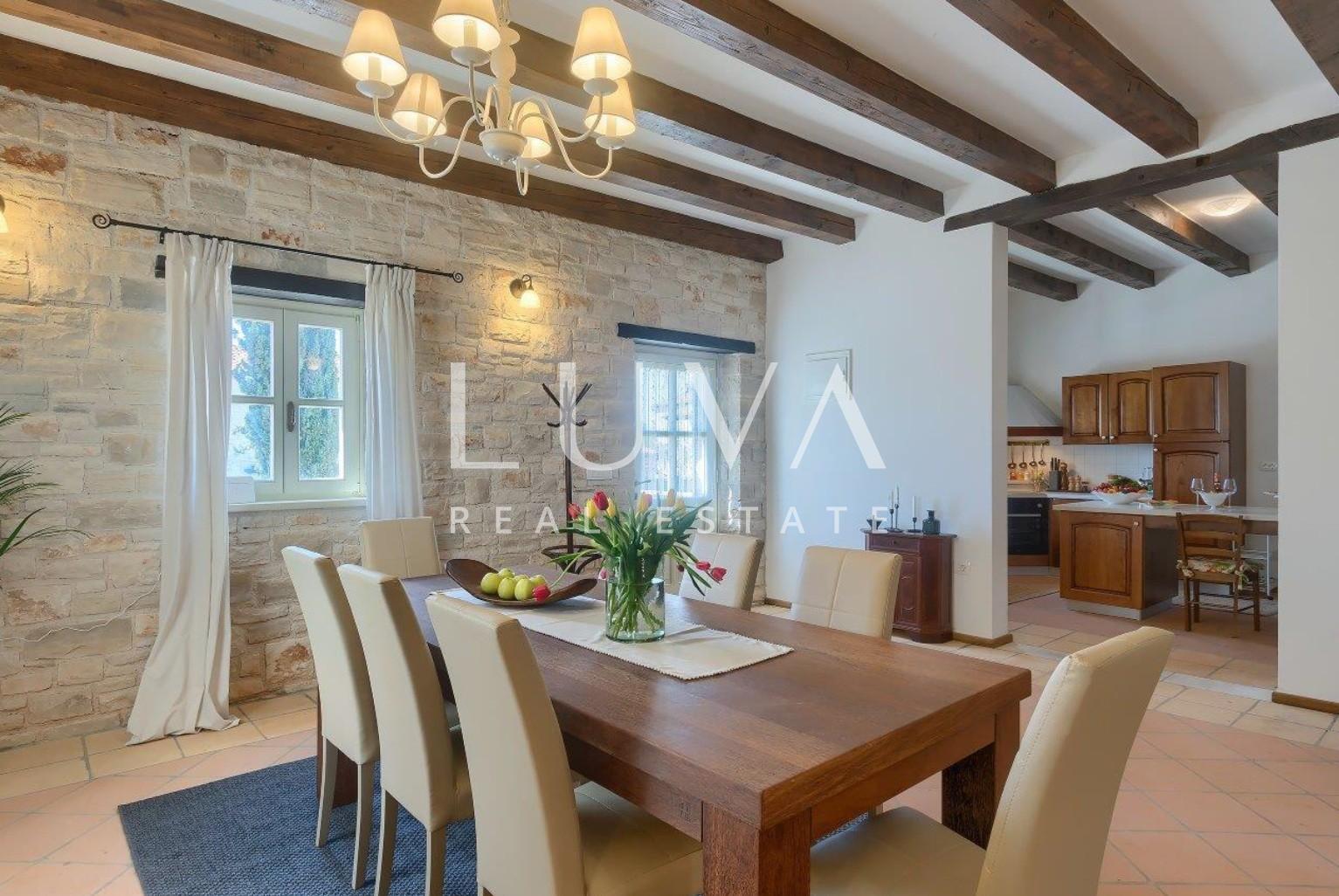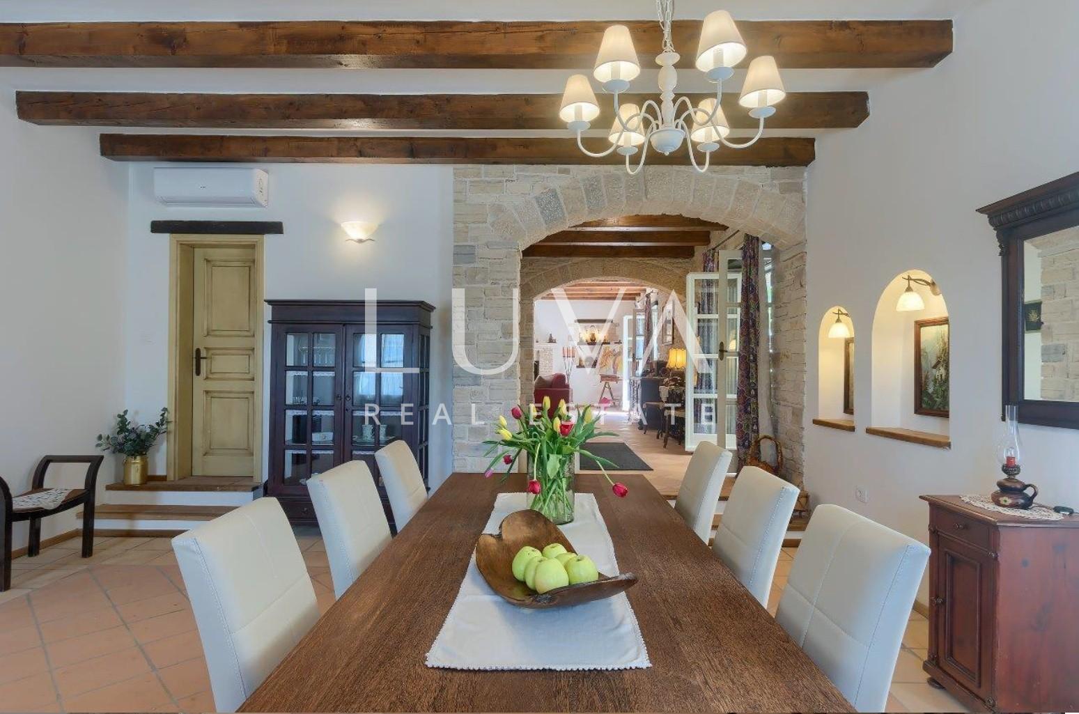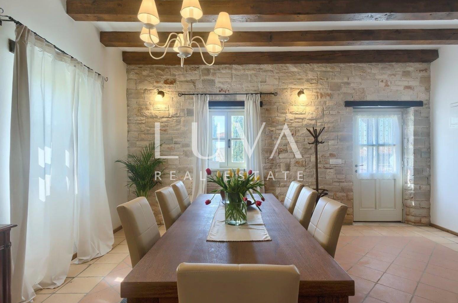 In a quiet location near Tinjan, this refined stone villa with a swimming pool is an example of carefully restored Istrian architecture, blending tradition with modern luxury. The complete renovation in 2021 brought a fresh, contemporary character, while authentic elements such as dry stone walls, wooden beams, and metal shutters were preserved. Notably, underfloor heating was added on the ground floor, particularly valuable for stone buildings as it provides a healthy indoor climate and comfortable living year-round. The villa is 4-star rated, equipped to accommodate eight guests, but due to its high standards, it could easily qualify as 5-star.
