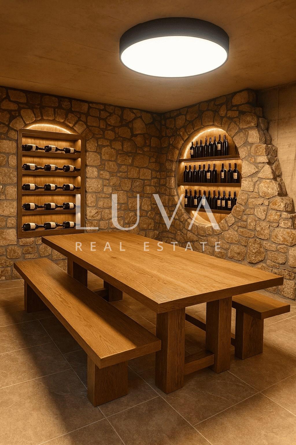 There is also a wine cellar, a bathroom, an additional toilet, and a wellness area with a sauna, which opens directly onto the pool and sunbathing terrace.