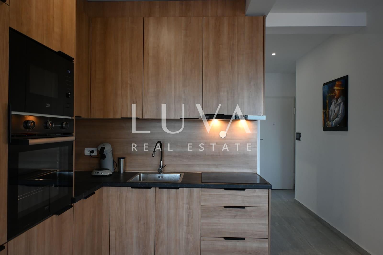 The apartment is situated on a gentle elevation, providing a stunning sea view and plenty of natural light through large windows and a spacious balcony.