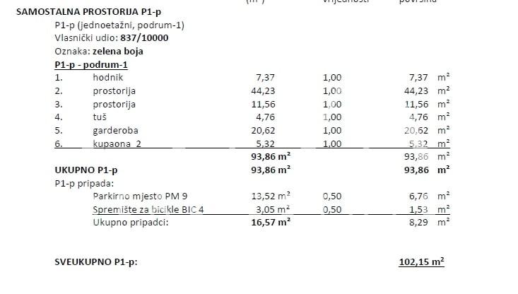The apartment covers a total area of 102.15 m² (expressed with coefficients), while the interior area is 93.86 m². It consists of two rooms, a shower, a wardrobe, and a bathroom. The space offers the possibility of adaptation for different purposes – it can be used as residential, business, or recreational space.