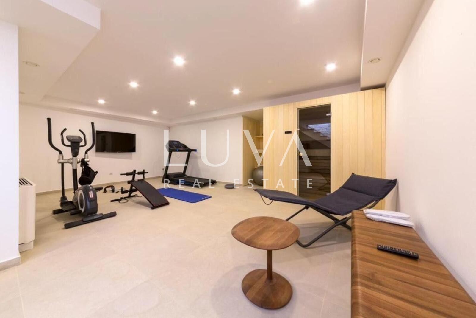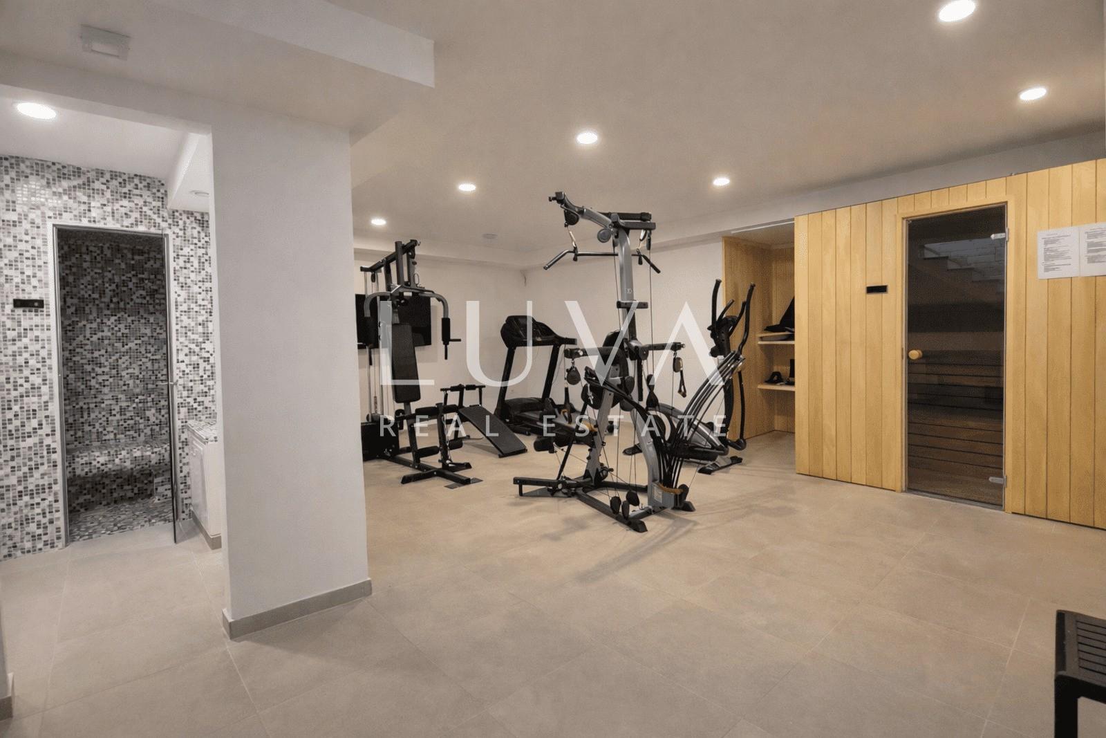 The basement includes a wellness area with a sauna and shower, as well as a fully equipped fitness room, adding an extra level of luxury and a private spa experience.