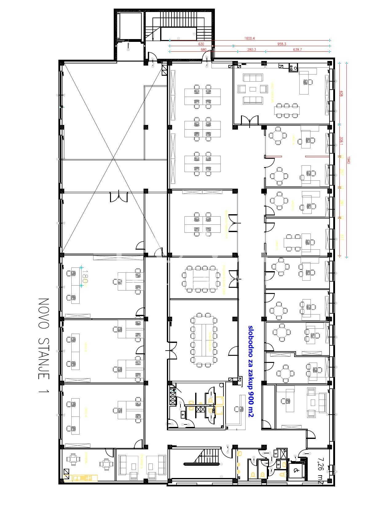 Available for rent is a representative office space of 1,100 m², located on the first floor of a commercial building with a large parking area in front.