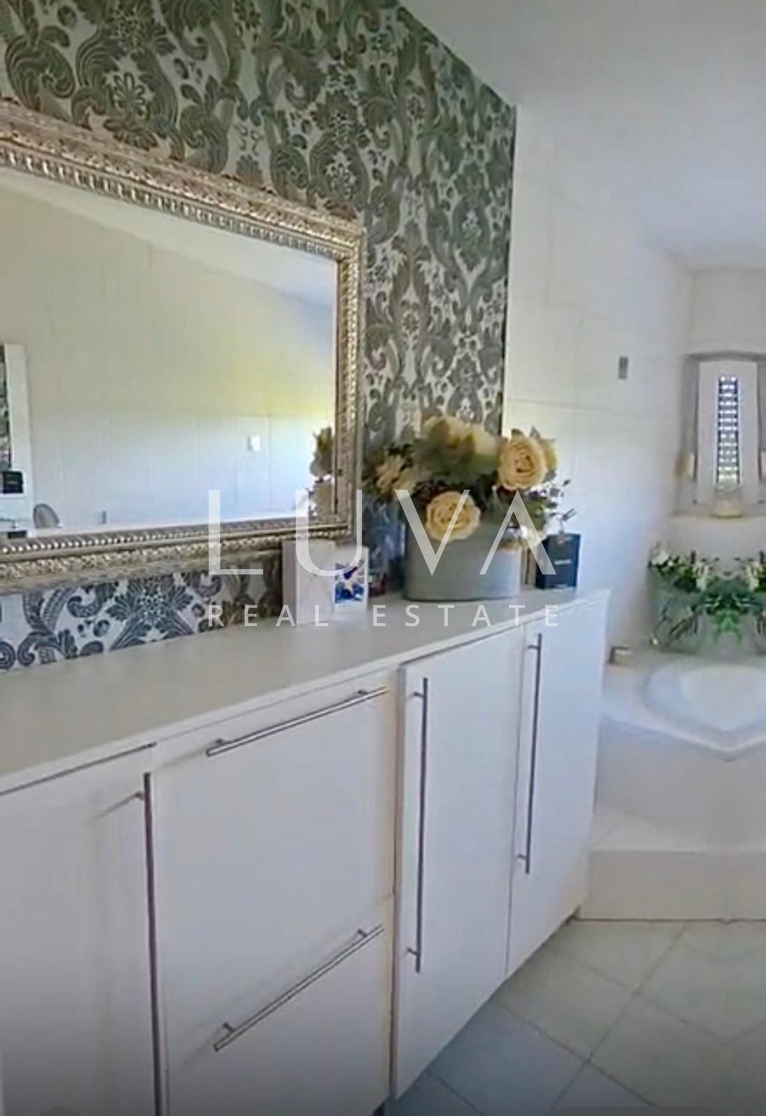 Prostrani dnevni boravak koji se kroz staklene stijene otvara prema terasama i zelenilu stvara harmoniju interijera i eksterijera, nudeći luksuznu prozračnost i maksimalan komfor, a kuhinja se u svom otvorenom konceptu savršeno nadovezuje na blagovaonicu, stvarajući fluidan i funkcionalan prostor idealan za svakodnevni život i druženja. Iz svih prostorija može se izaći u bajkoviti, prostrani vrt.