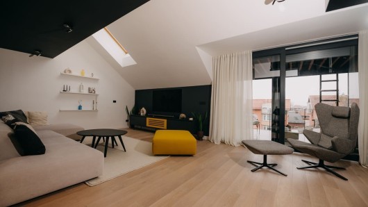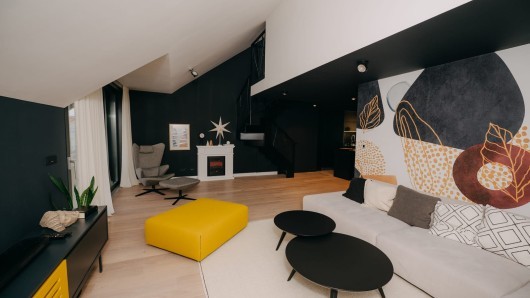 Stan se nalazi na prvom i drugom katu urbane vile s ukupno dva stana, pri čemu zauzima zadnju etažu objekta i jedini je stan na katu, što mu daje obilježja pravog penthousea. Dvoetažni raspored omogućuje jasno odvajanje privatnog i dnevnog dijela stana te dodatno naglašava osjećaj prostranosti i ekskluzivnosti.