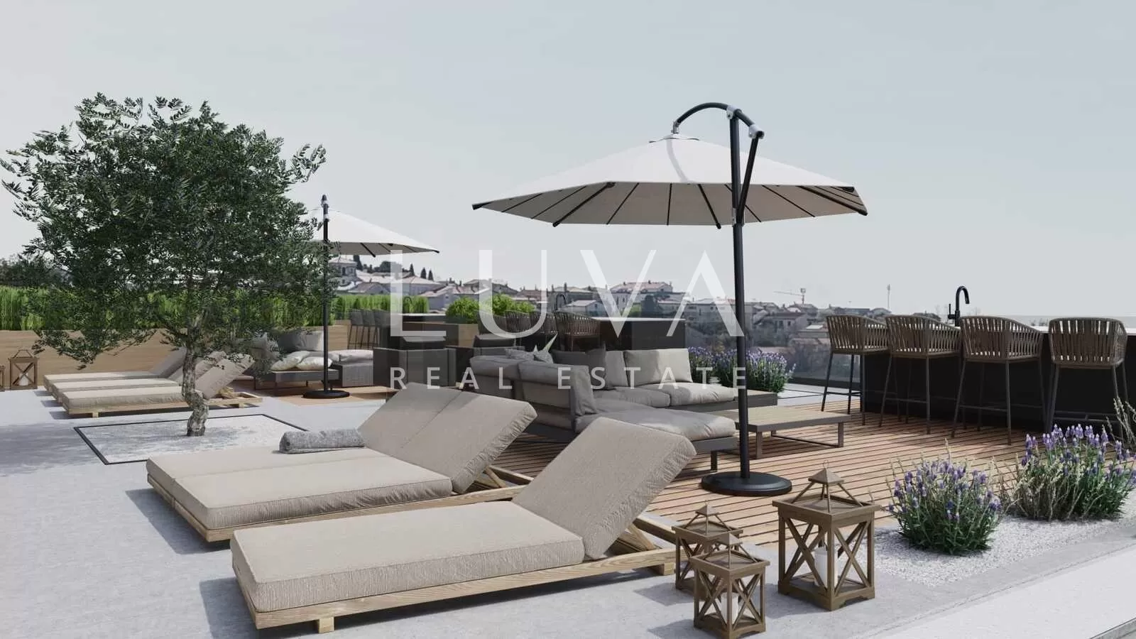 Stan se sastoji od ulaznog hodnika, prostrane open-space kuhinje s blagovaonicom i dnevnim boravkom iz kojeg se izlazi na terasu, savršenu za jutarnju kavu ili večernje opuštanje. Ima dvije spavaće sobe od kojih jedna ima izlaz na balkon te moderno uređenu kupaonicu.Stan ima vlastitu krovnu terasu sa pripremom za jacuzzi, saunu, ljetnu kuhinju i 2 parkirna mjesta koja su uključena u cijenu.