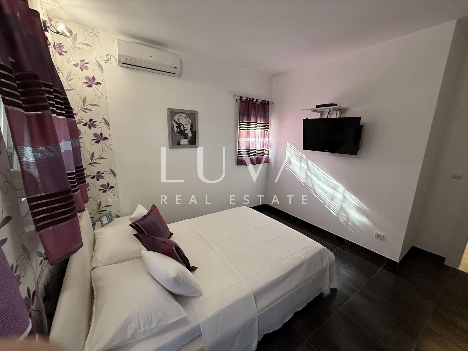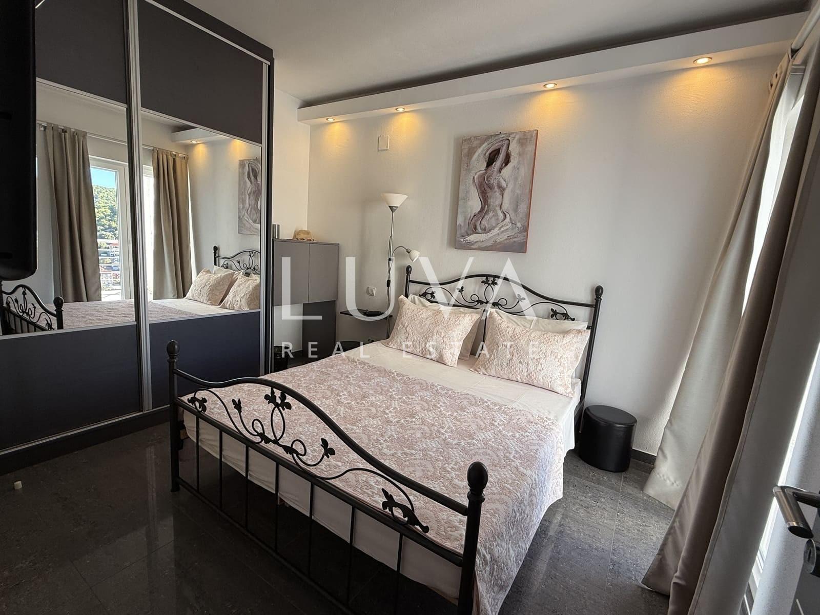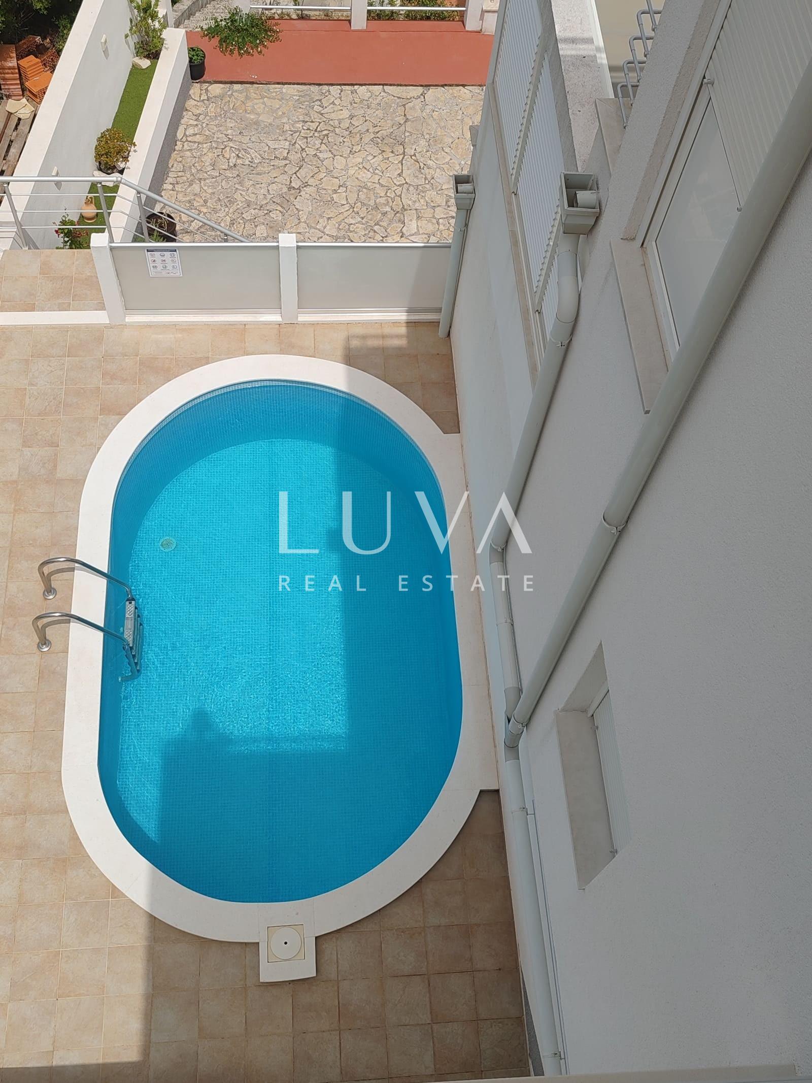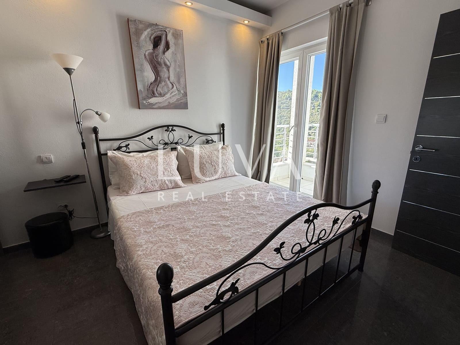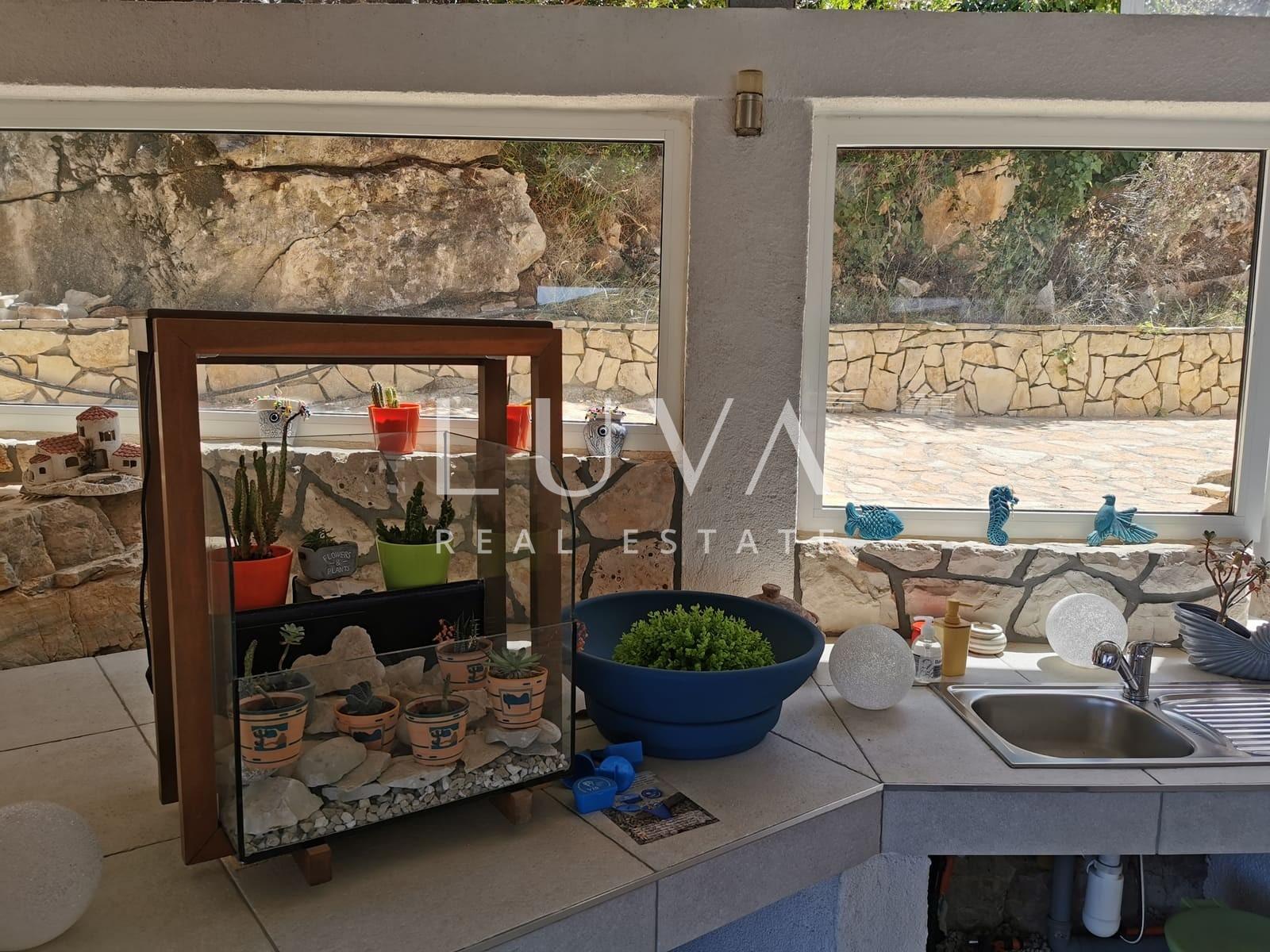 Vanjski dio kuće obogaćen je bazenom s kojeg se pruža impresivan panoramski pogled na more, savršen za opuštanje tijekom toplih ljetnih dana. Prostrana okućnica nudi brojne mogućnosti uređenja dodatnih sadržaja, dok osigurana parkirna mjesta za četiri automobila dodatno povećavaju praktičnost nekretnine.