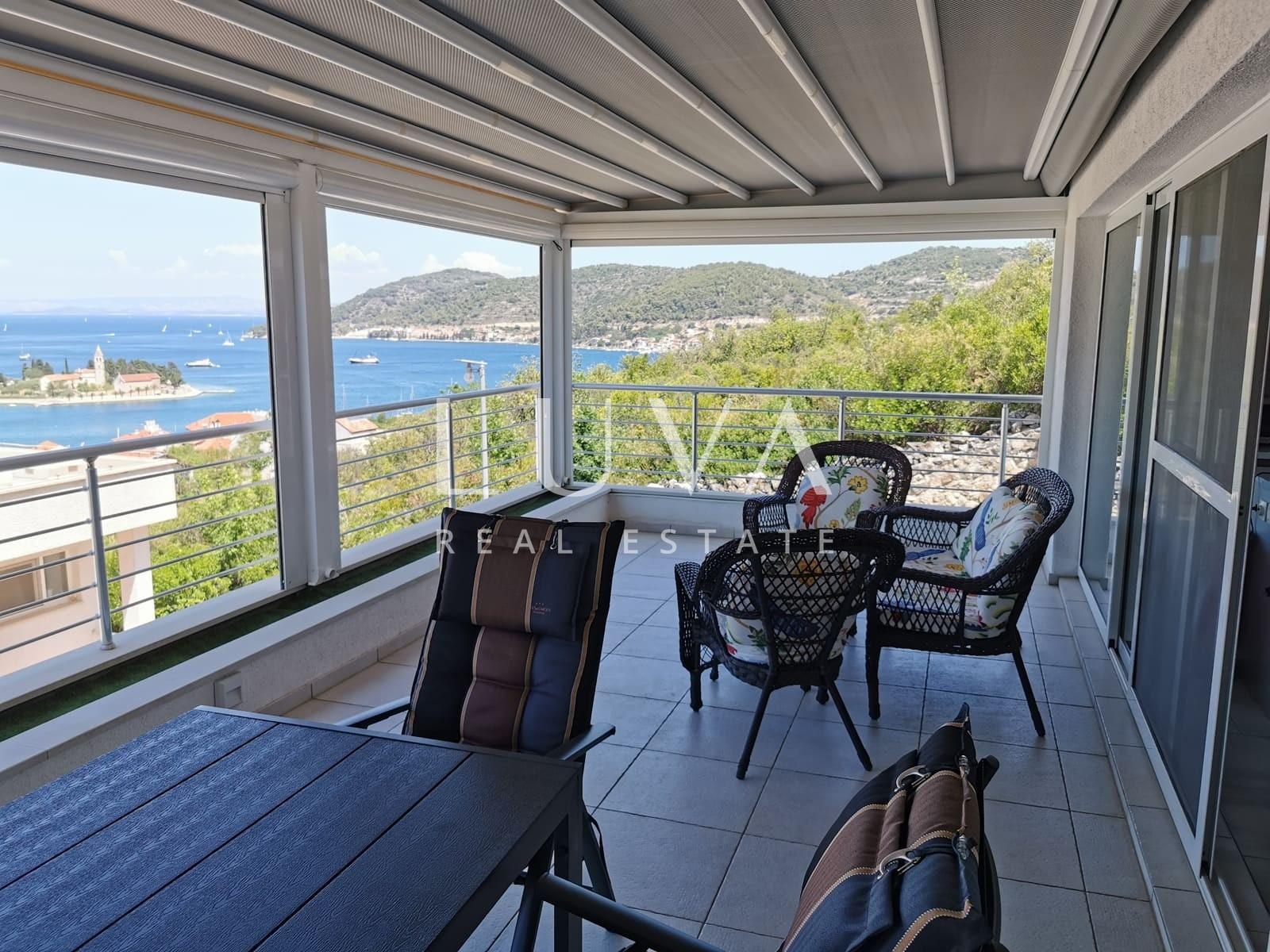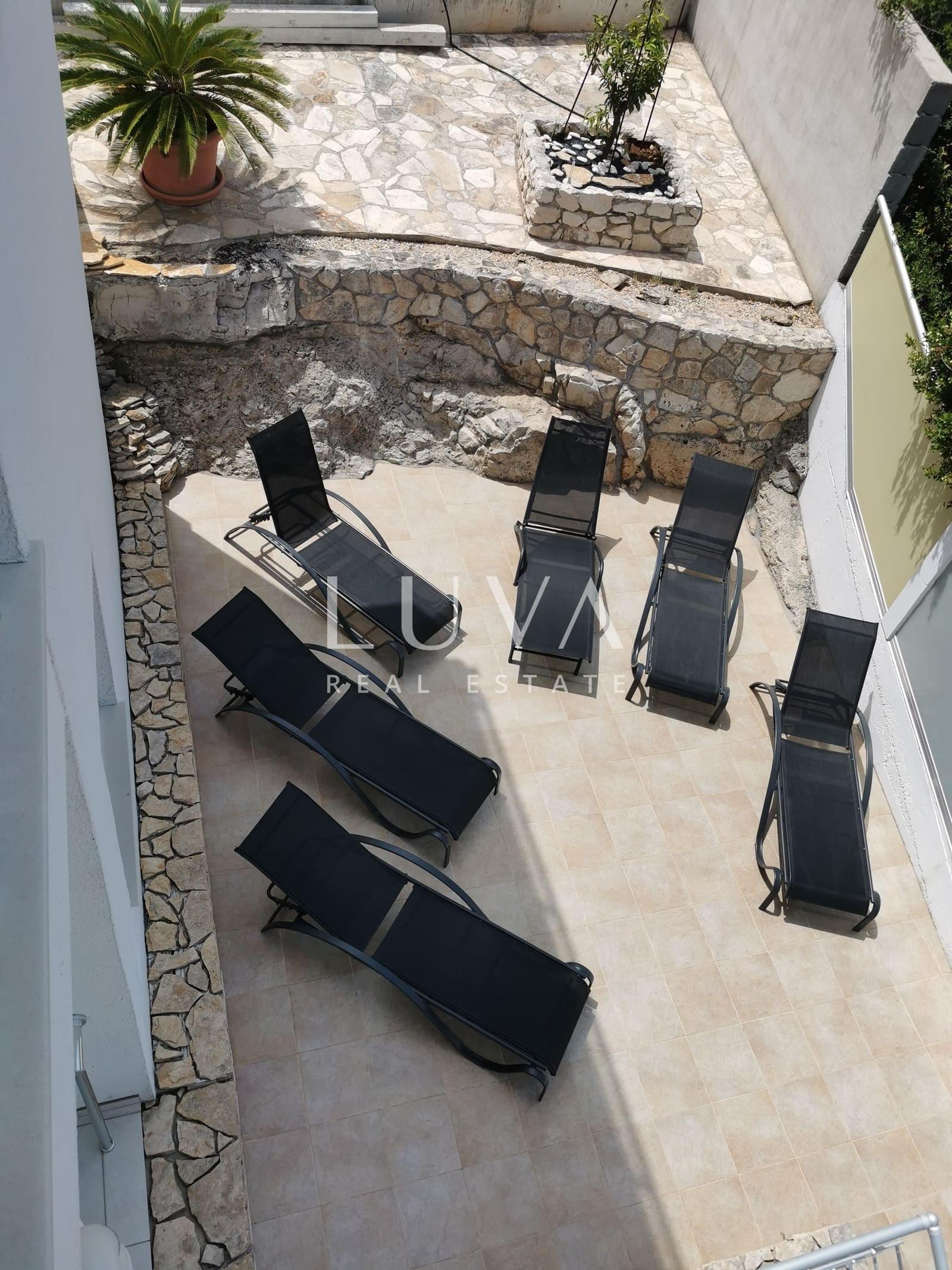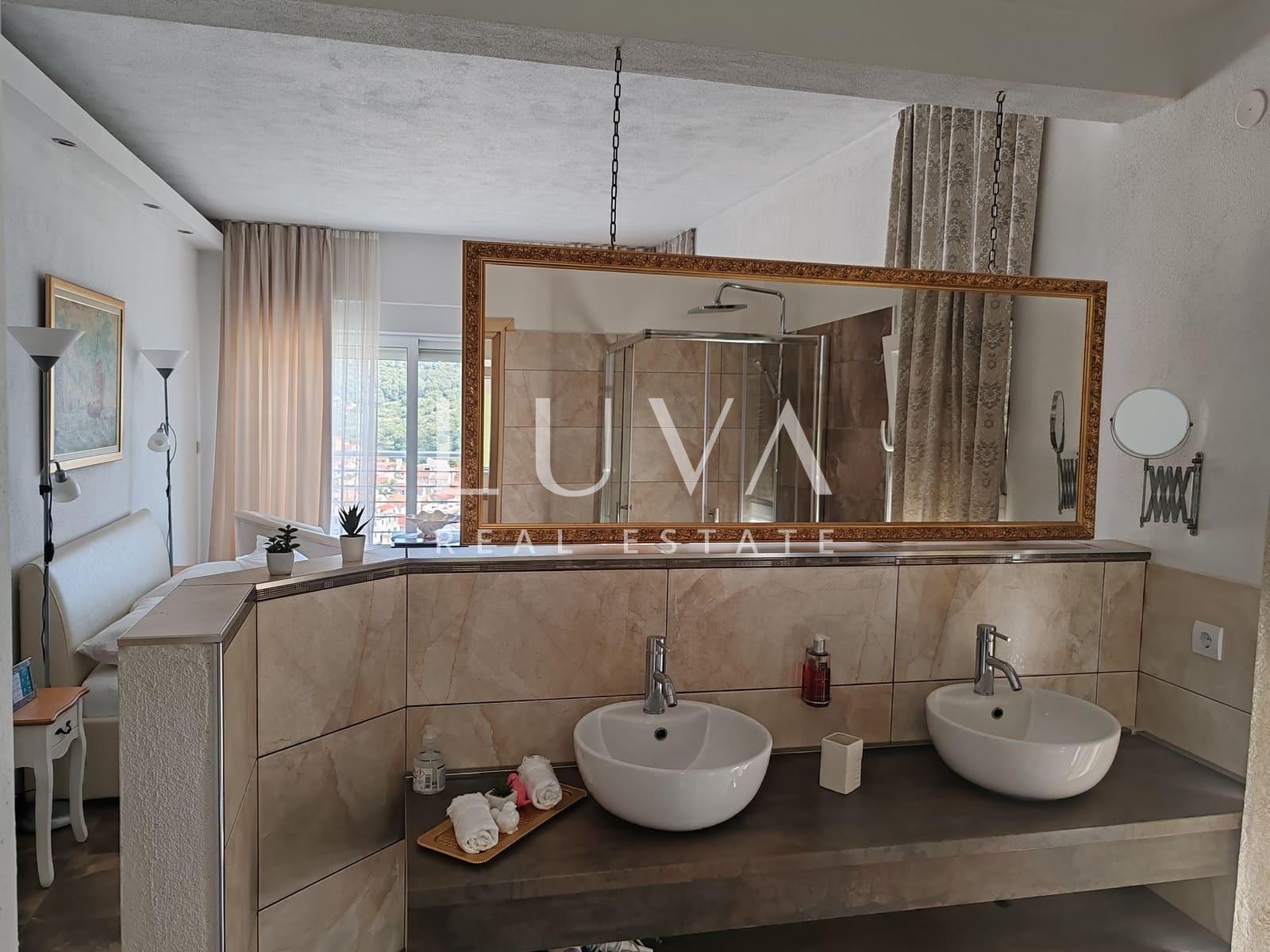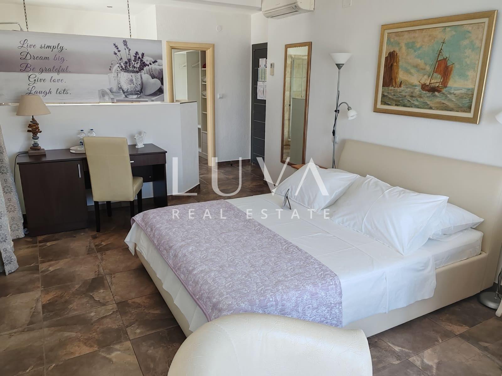 Vanjski dio kuće obogaćen je bazenom s kojeg se pruža impresivan panoramski pogled na more, savršen za opuštanje tijekom toplih ljetnih dana. Prostrana okućnica nudi brojne mogućnosti uređenja dodatnih sadržaja, dok osigurana parkirna mjesta za četiri automobila dodatno povećavaju praktičnost nekretnine.