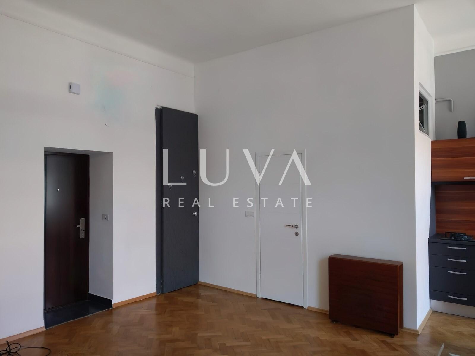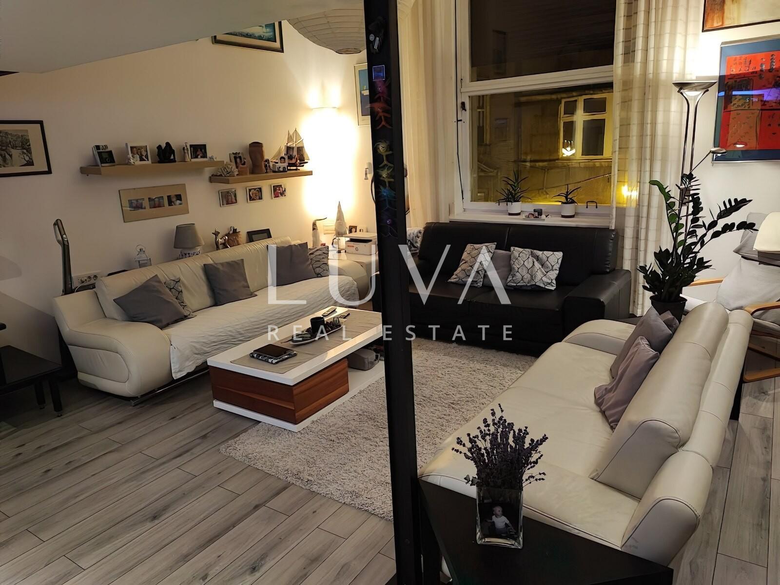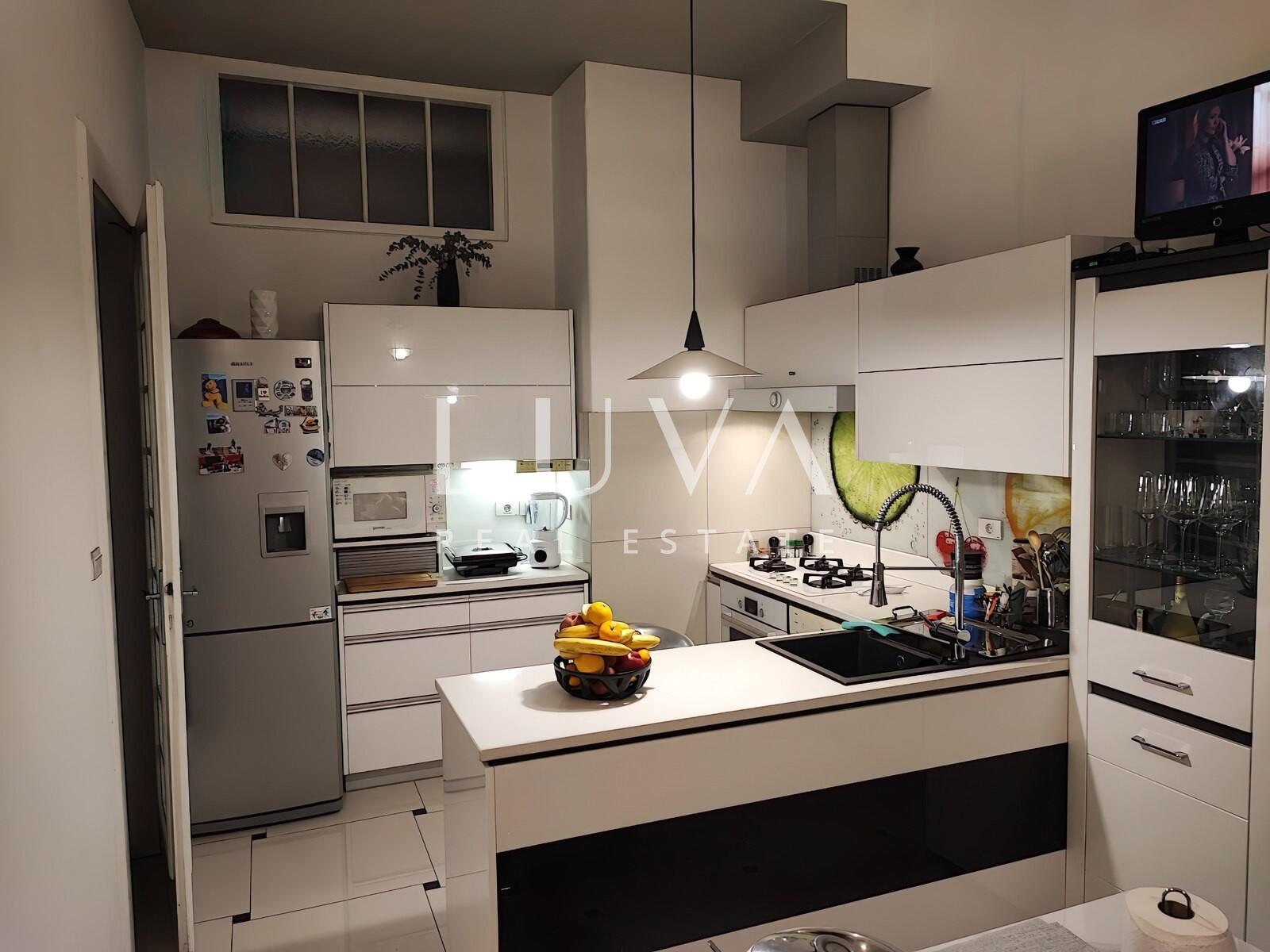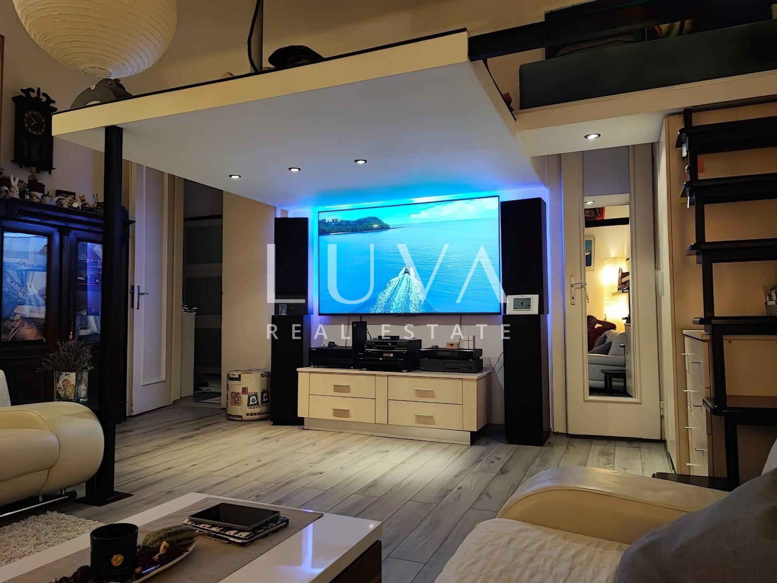 Nalazi se na drugom katu zgrade s liftom, a sastoji se od prostranog dnevnog boravka s galerijom, kuhinje, kupaonice, gostinjskog toaleta, ulaznog prostora i balkona. Jedan dio stana cca 40m2 odvojen je i pretvoren u zaseban prostor s vlastitom kupaonicom i kuhinjom koji se trenutno nalazi u dugoročnom najmu.