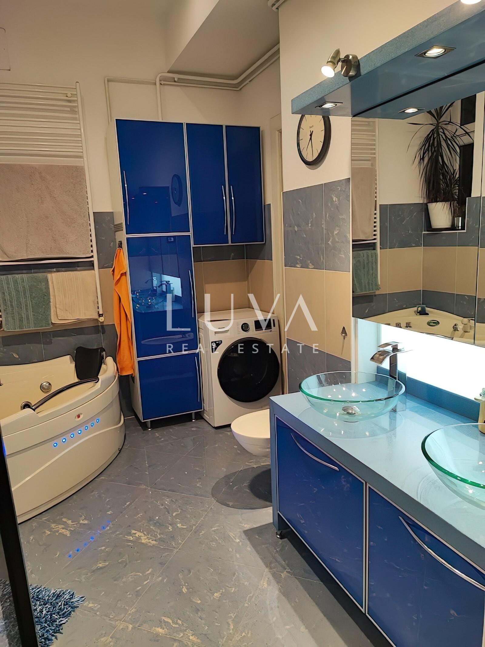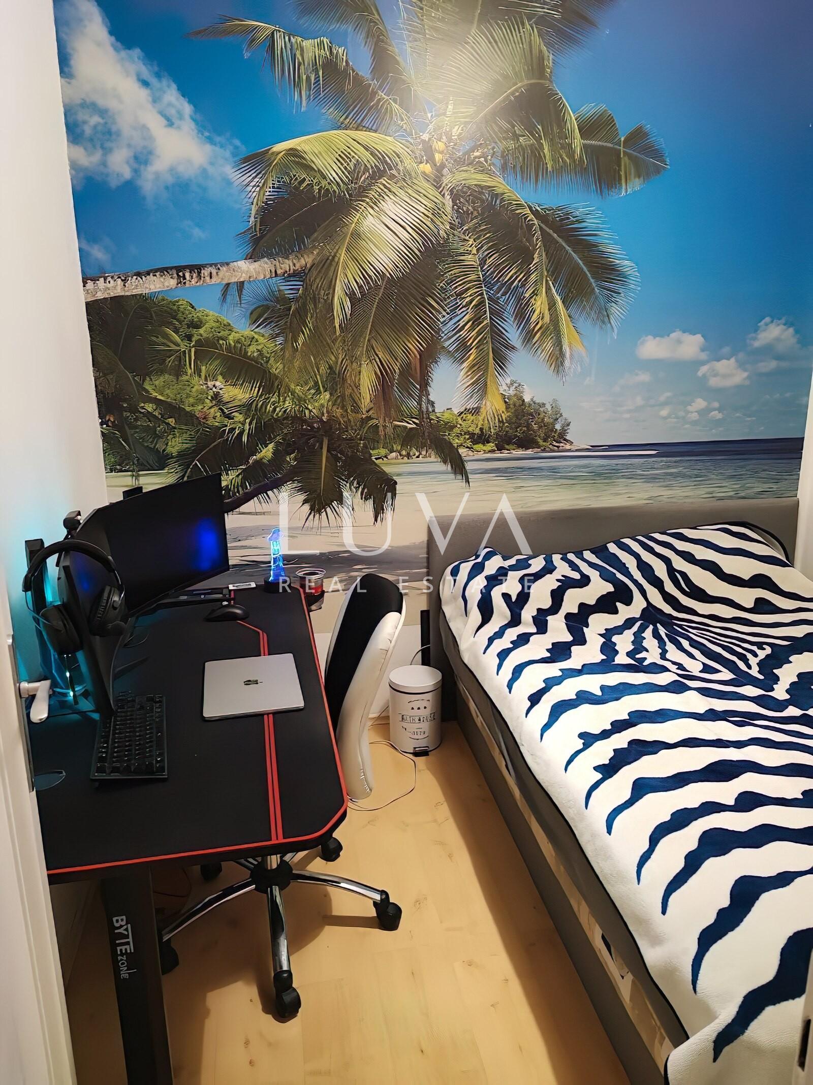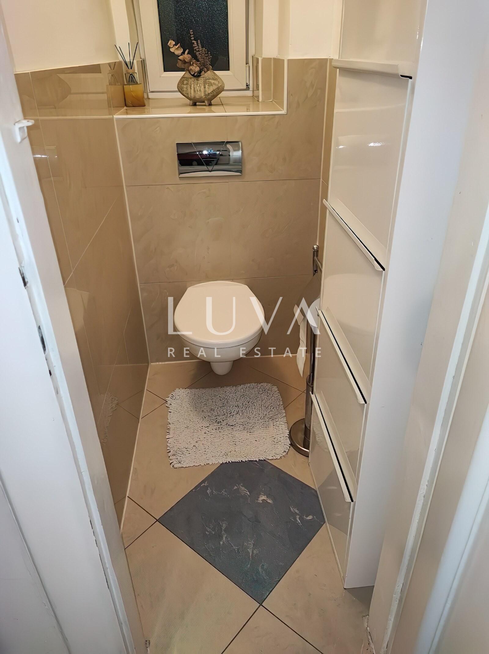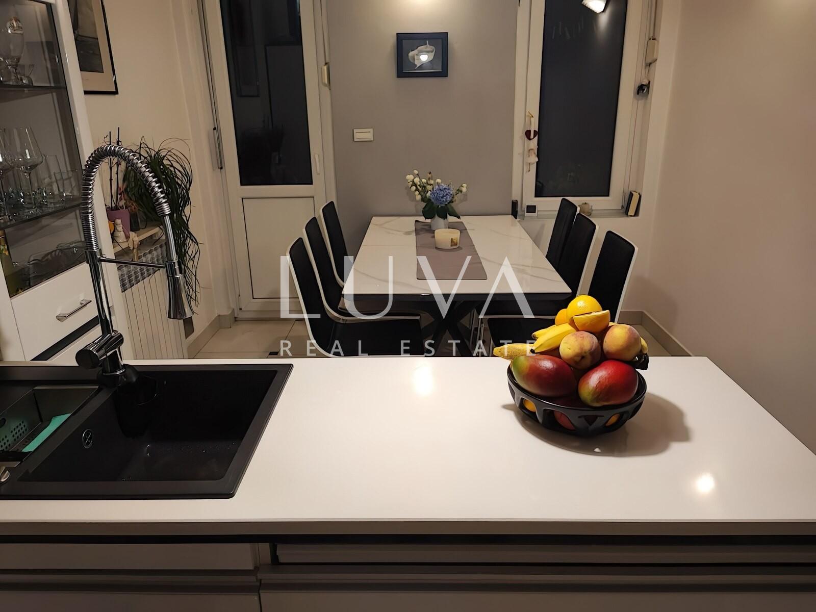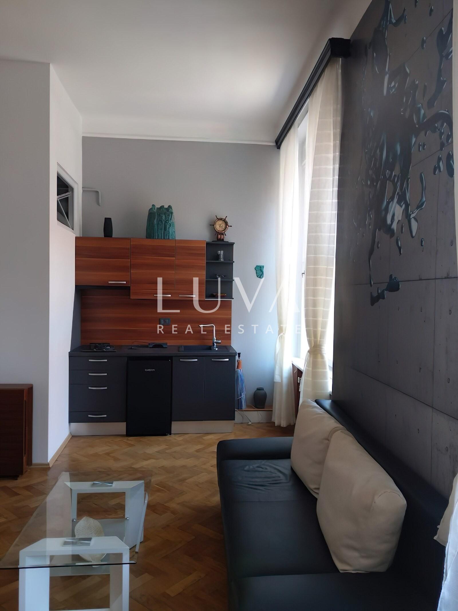 Nalazi se na drugom katu zgrade s liftom, a sastoji se od prostranog dnevnog boravka s galerijom, kuhinje, kupaonice, gostinjskog toaleta, ulaznog prostora i balkona. Jedan dio stana cca 40m2 odvojen je i pretvoren u zaseban prostor s vlastitom kupaonicom i kuhinjom koji se trenutno nalazi u dugoročnom najmu.