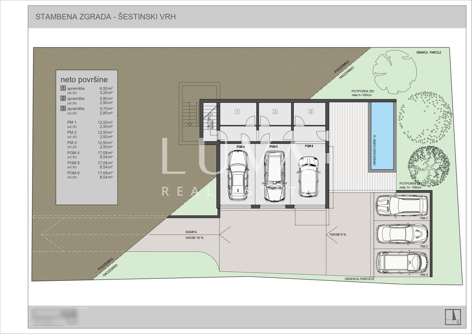 Stanu također pripada garažno parking mjesto kao i vanjsko parking mjesto u dvorištu zgrade, te spremište u podrumu.