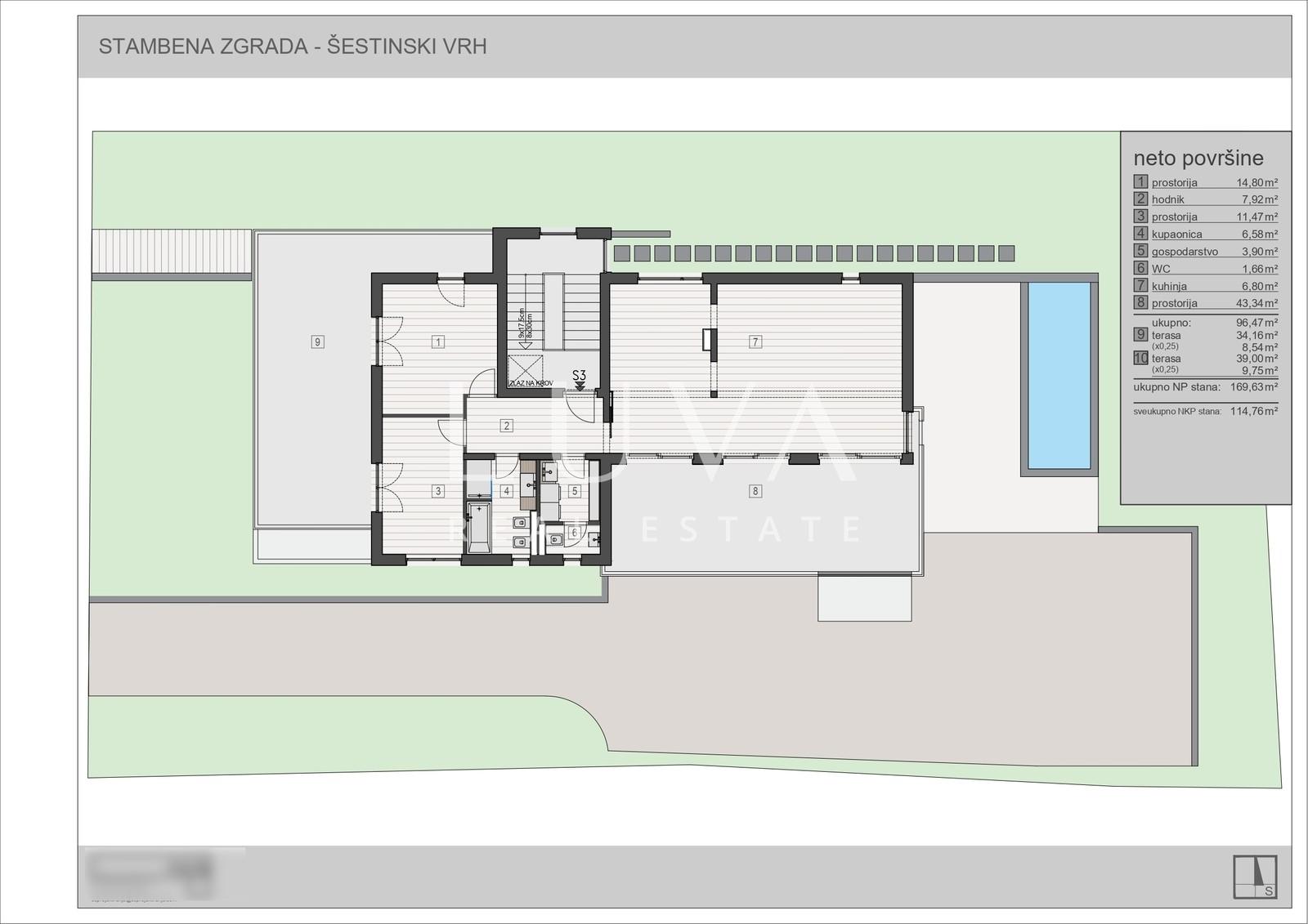 Nalazi se na drugom katu manje stambene zgrade s ukupno tri stana, a sastoji se od prostranog dnevnog boravka, kuhinje, blagovaonice, dvije spavaće sobe, kupaonice, gostinjskog toaleta, te dvije terase(natkrivena i nenatkrivena).